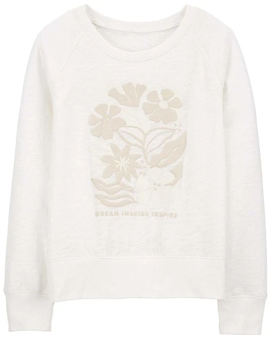 Лонгслив футболка с принтом Carter's из категории майки и футболки для девочек 4–14 лет выполнен в молочно-белом цвете с нежным бежевым флоральным рисунком и аккуратной надписью внизу. Мягкий трикотаж 60% хлопок, 40% полиэстер приятен к телу и подходит для активного дня. Круглая горловина и длинный рукав обеспечивают удобную посадку, а спокойный дизайн легко сочетается с джинсами, леггинсами и юбками — для школы, прогулок и дома.