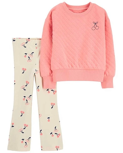 Комплект одежды Carter’s из двух предметов для девочек 0–24 мес: стеганый розовый пуловер с мягкими манжетами и небольшим принтом вишенки на груди и светлые брюки с повторяющимся рисунком вишен. Комплекты одежды удобно носить дома, на прогулке и в поездках: вещи легко сочетать и быстро переодевать малыша. Материал: пуловер 83% хлопок, 17% полиэстер; брюки 95% хлопок, 5% эластан — приятная посадка, свобода движений и комфорт на каждый день.