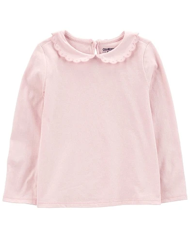 Блузка лонгслив с воротником OshKosh B'gosh для девочек 2–5 лет — нежная базовая модель из категории майки и футболки для повседневных образов. Пудрово-розовый цвет легко сочетается с юбками, сарафанами и джинсами, а аккуратный круглый воротник с волнистым краем добавляет нарядности без лишнего декора. Сзади предусмотрена застёжка на пуговицу, чтобы было удобнее переодевать ребёнка. Материал 60% хлопок, 40% полиэстер приятен к телу и практичен в уходе, подходит для детского сада, прогулок и праздников.